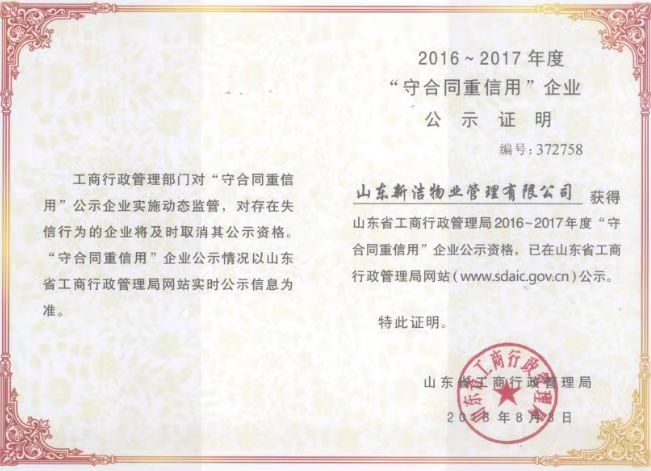 近日,山东新洁物业管理有限公司荣获山东省工商局2016~2017年度“守合同重信用企业”荣誉称号,并颁发证书。这是继荣获潍坊市2015~2016年度“守合同重信用企业”荣誉称号后,又上一层楼,再次荣获省级重要殊荣。
