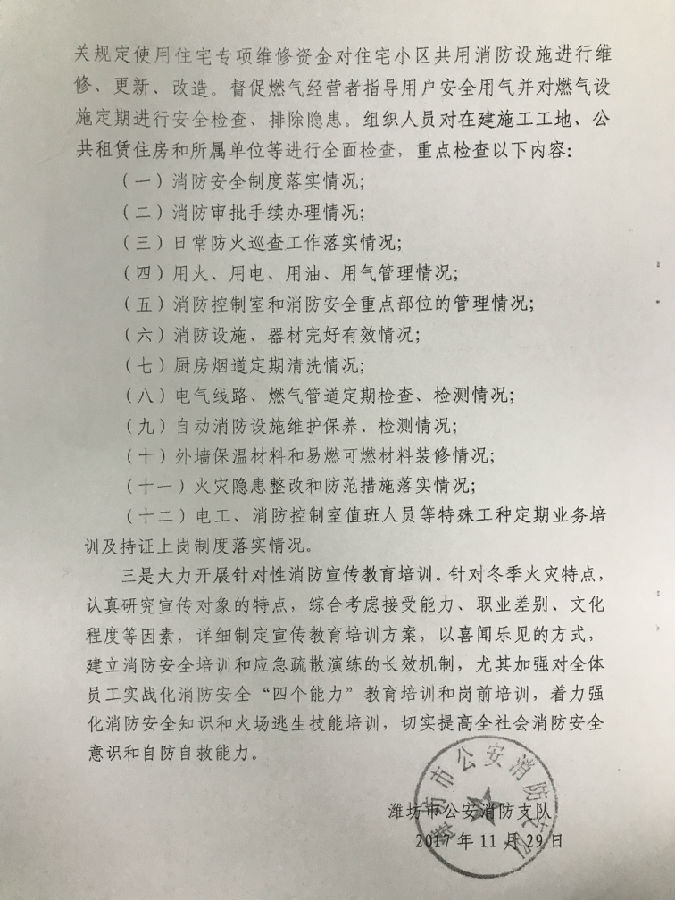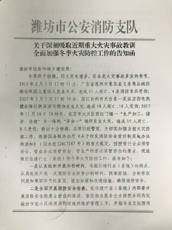 冬季特别是岁末年初,用火用电增多,是各类火灾事故多发季节。各地相继发生多起火灾事故,教训十分惨痛,必须引起警觉。现将市消防支队《关于深刻吸取近期重大火灾事故教训全面加强冬季火灾防控工作的告知函》转发给你们,请对照要求,按照管行业必须管安全、管业务必须管安全、管生产经营必须管安全的要求,结合各自实际,认真贯彻落实。