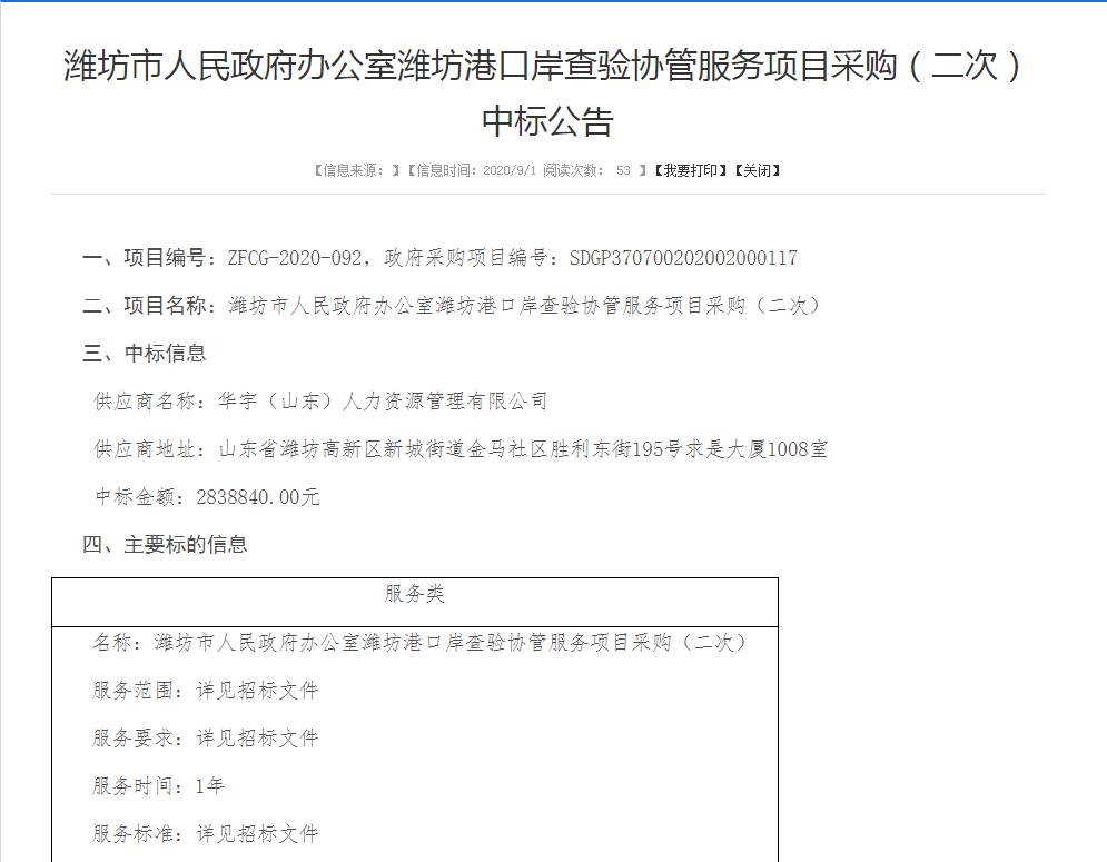 2020年9月1日,华宇(山东)人力资源管理有限公司中标潍坊港口岸查验协管服务项目。