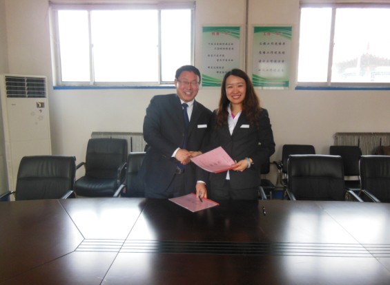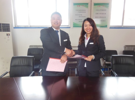 公司孙总与区域副总靳世保签订责任书合影