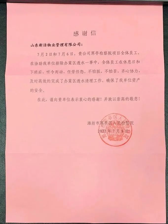 来自寒亭区人民检察院的感谢信 2022年7月20日,山东新洁物业管理有限公司收到了来自寒亭区人民检察院的感谢信。就7月2日和7月6日,新洁物业寒亭区人民检察院项目全体员工,在协助检察院排除办案区透水一事中,全体员工在休息日和下班后听令而动,任劳任怨,不怕脏,不怕苦,齐心协力,及时高效的完成办案区透水清理工作,确保了检察院资产安全,对此表示衷心的感谢,并致以崇高的敬意!