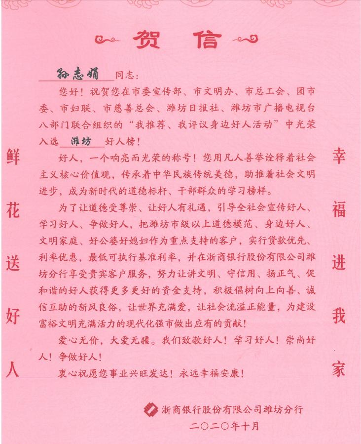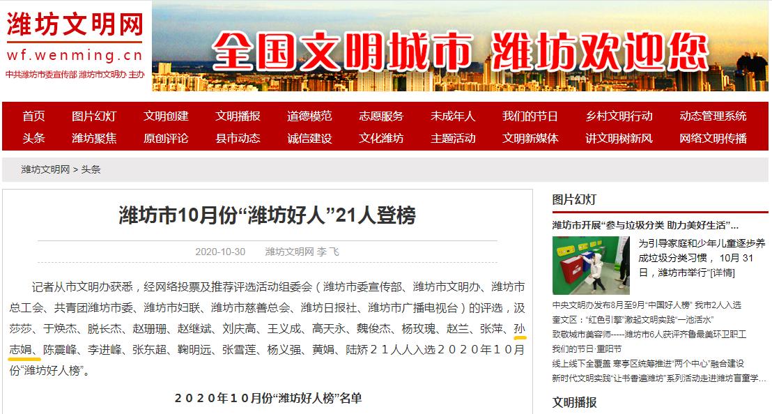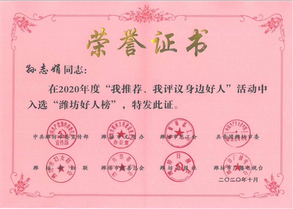 经“潍坊好人”推荐评选活动组委会的评选以及网络投票,山东新洁管理集团董事长孙志娟同志入选2020年10月份“潍坊好人榜”。