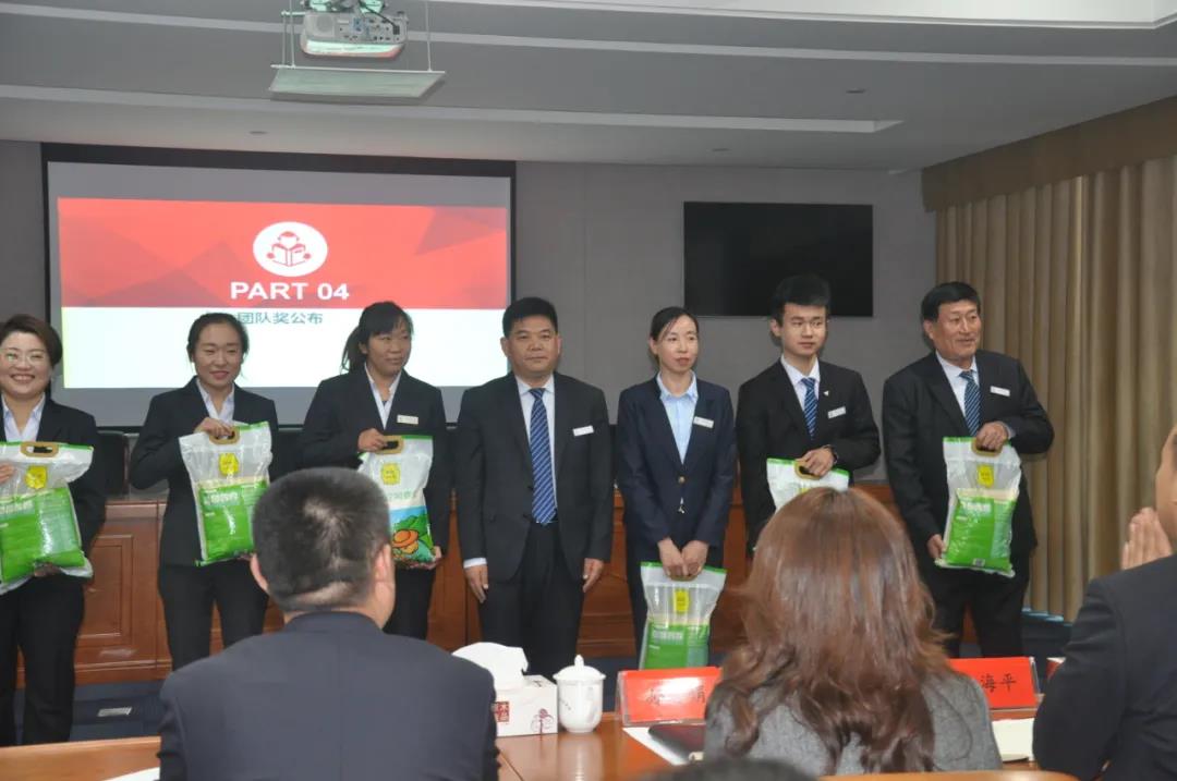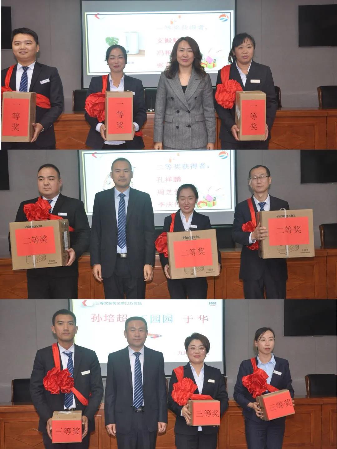 第五个是对第三季度积分管理表现优异的员工进行表彰。经过第三方的反复核算,获得一等奖的是支殿魁、冯艳、张茹茹,由孙志娟董事长为获奖者颁奖;获得二等奖的是孔祥鹏、周芝营、李庆伟,由孙总为获奖者颁奖;获得三等奖的是孙培超、王园园、于华,由张总为获奖者颁奖。