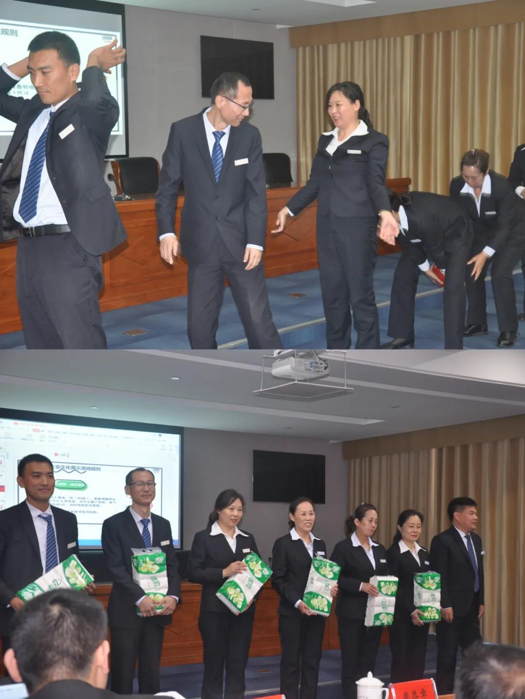 热身运动后,进入第一个环节。首先,由张总带领大家进行宣誓,并合唱司歌,全体人员***澎湃,唱出了中国最强音;随后,进行企业文化分组PK展示,参会人员分成6个队,分别起自己的队名队呼,由队长带领大家上台进行司歌展示和企业文化的展示,不仅是对团队向心力、凝聚力的体现,也是对企业文化的重温,经过激烈的比拼,孙培超经理的红旗队获得第一名的好成绩。随后,由公司领导为获奖团队颁奖。