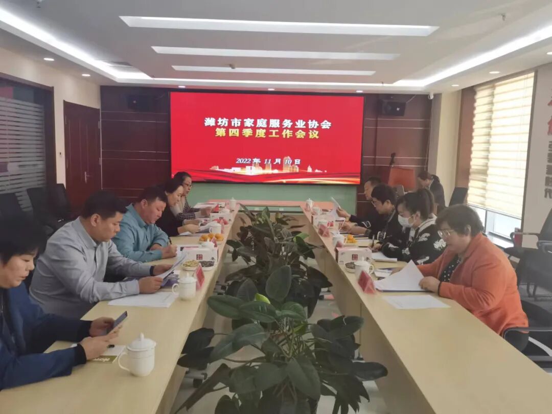 11月10日,潍坊市家庭服务业协会第四季度工作会议在瀚宸(山东)控股集团会议室召开。会议听取了前段工作情况汇报;对《关于充分发挥家协组织作用,助力全市家庭服务业提质扩容的措施意见(讨论稿)》(以下简称:《意见(讨论稿)》)《潍坊市家庭服务业协会二0二三年工作计划(以下简称:《计划》)》进行了讨论和交流;张向芹会长作了重要讲话,与会人员参观了瀚宸(山东)控股集团并观看了企业宣传片。常务会长孙志娟、副会长鞠圣、潘霞,监事长张学刚,秘书长范玉萍、副秘书长刘涛和华都职业培训学校业务校长王敏(代表李垒副会长)班子成员与会。